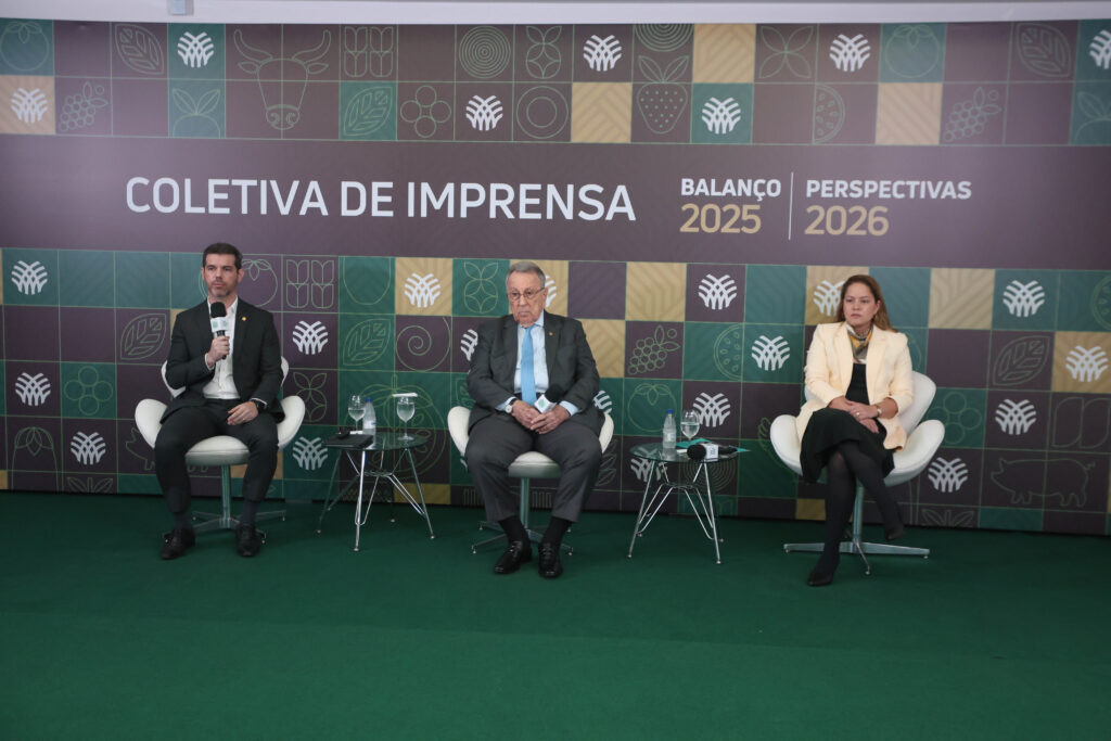 O balanço do setor agropecuário em 2025 e as perspectivas para 2026 foram apresentados em uma coletiva de imprensa, com a presença do presidente da CNA, João Martins, da diretora de Relações Internacionais, Sueme Mori, e do diretor técnico, Bruno Lucchi.