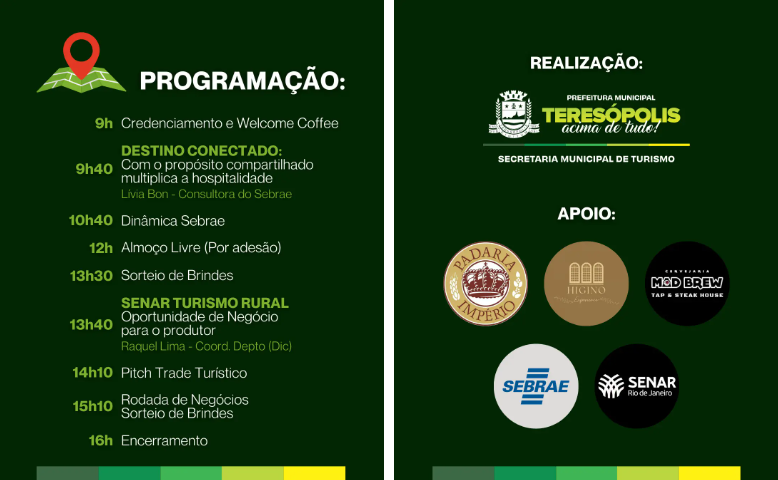 A Secretaria Municipal de Turismo de Teresópolis, com o apoio do Sebrae e do SENAR Rio (Serviço Nacional de Aprendizagem Rural), promove o 2º Encontro do Trade Turístico, um evento voltado ao fortalecimento do setor e à integração de profissionais e empreendedores do turismo local.